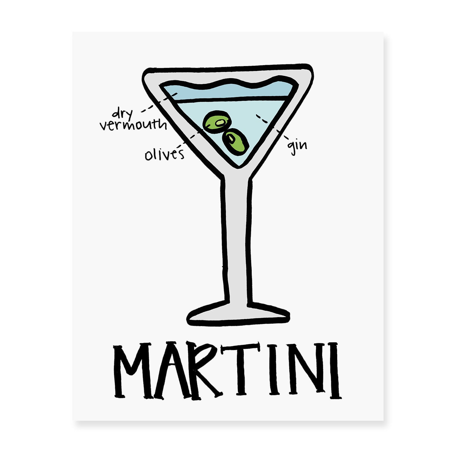 One hand-sketched martini cocktail diagram art print, printed on premium 100% cotton paper.