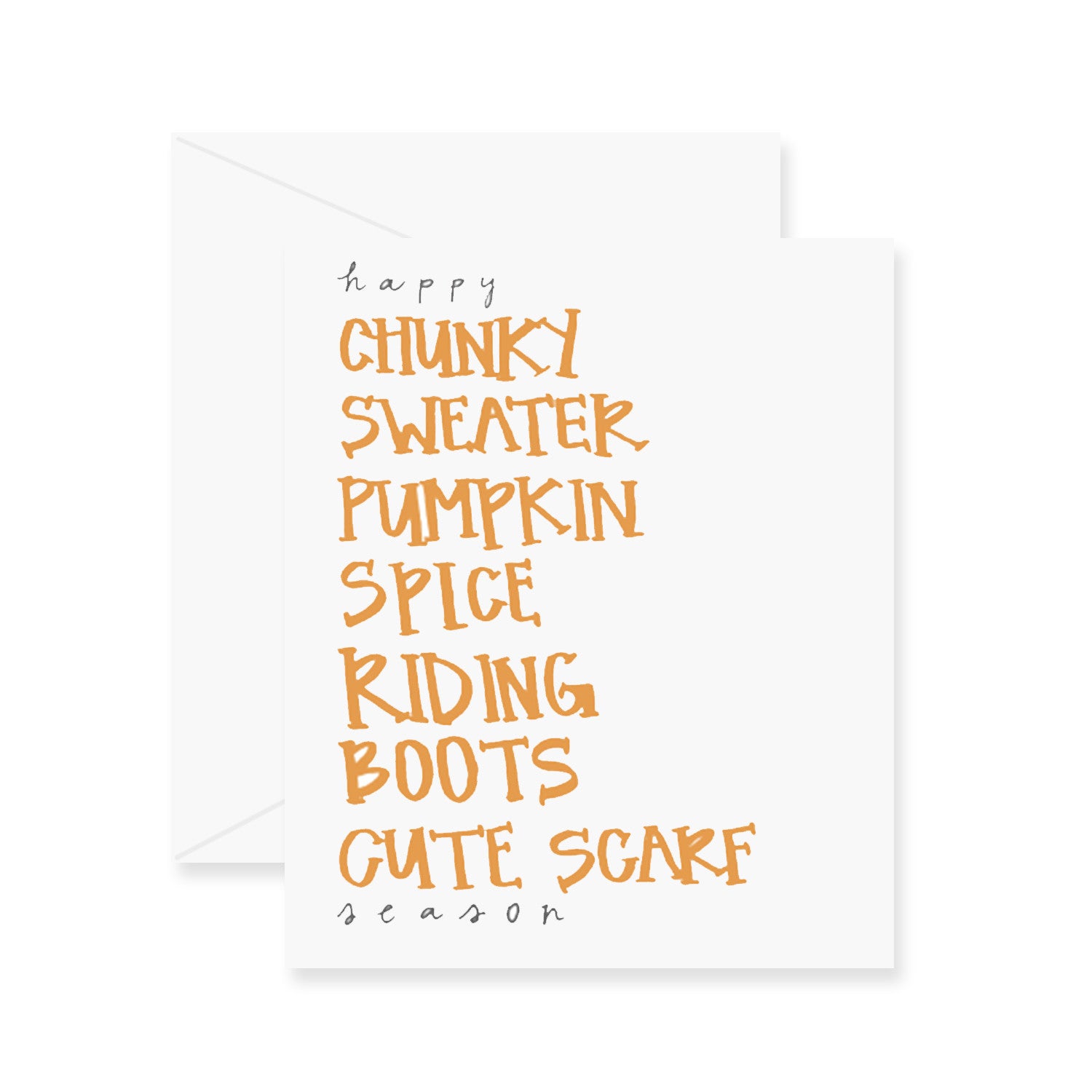 One hand-sketched "happy chunky sweater pumpkin spice riding boots cute scarf season" greeting card, printed on premium 100% recycled paper, with coordinating envelope.