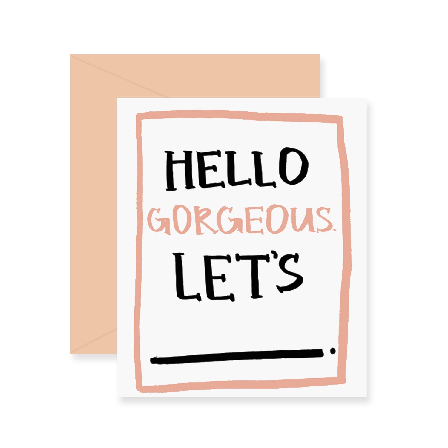 One hand-sketched "hello gorgeous let's ___________" greeting card, printed on premium 100% recycled paper, with coordinating envelope.