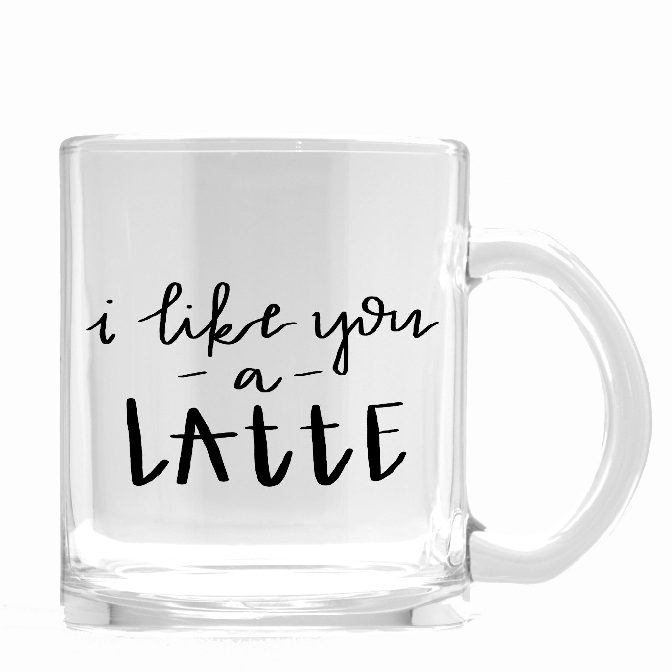 One hand-sketched "I Like You a Latte" glass coffee mug. Design is printed on both sides of the mug (lefties, rejoice!).