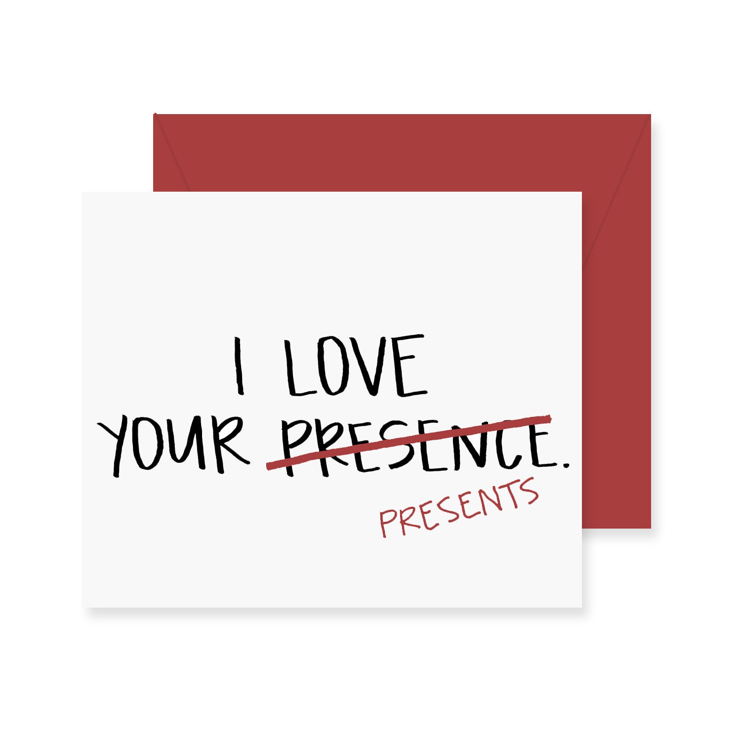 One hand-sketched "I love your presence/presents" greeting card, printed on premium 100% recycled paper, with coordinating envelope.