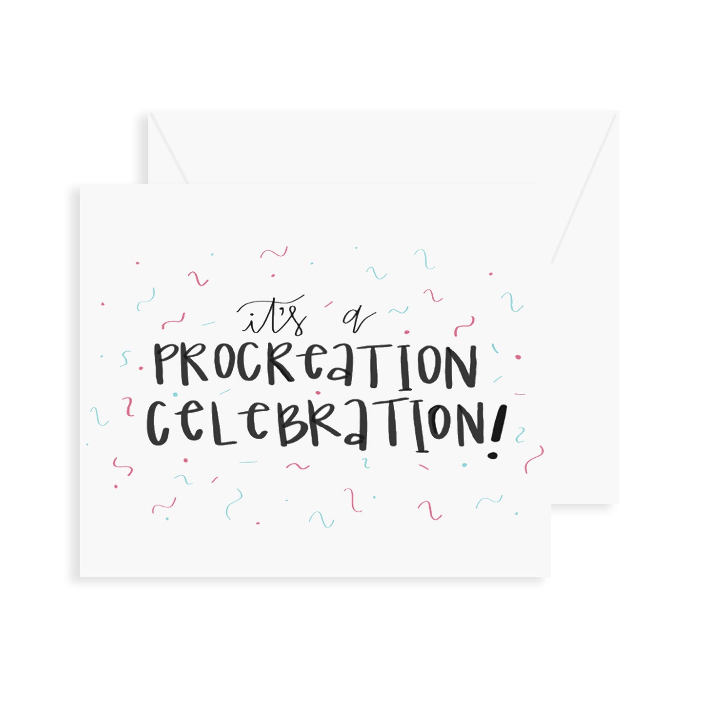 One hand-sketched "Procreation Celebration" new baby greeting card, printed on premium 100% recycled paper, with coordinating envelope.