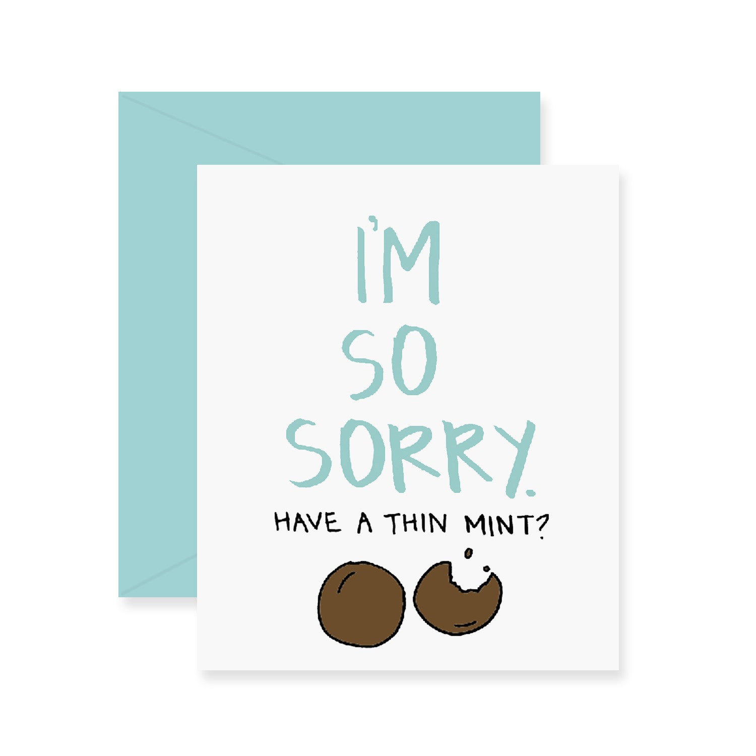 One hand-sketched "I'm so sorry... Have a thin mint?" greeting card, printed on premium 100% recycled paper, with coordinating envelope.