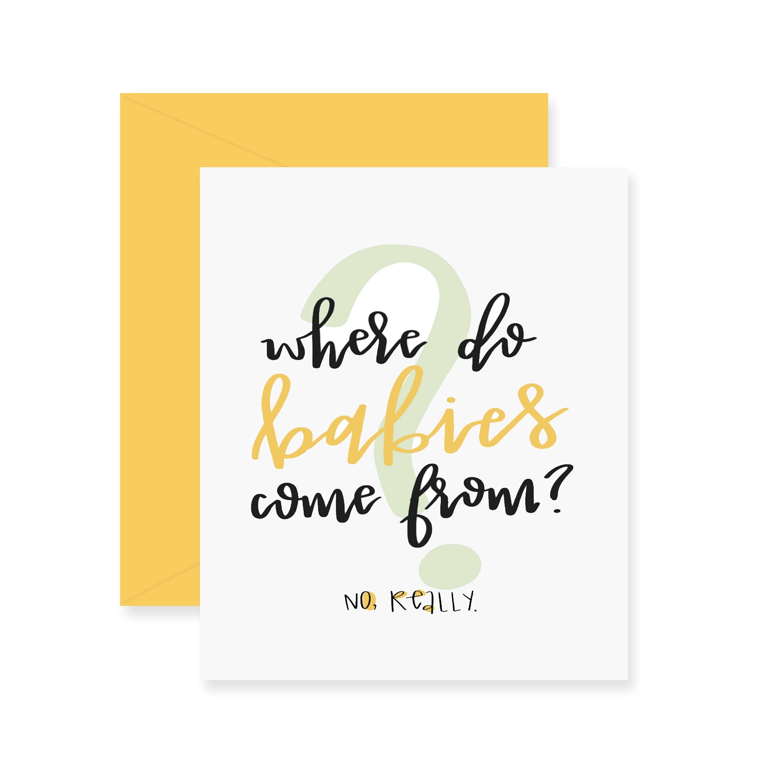 One hand-sketched "Where Do Babies Come From" greeting card, printed on premium 100% recycled paper, with coordinating envelope.