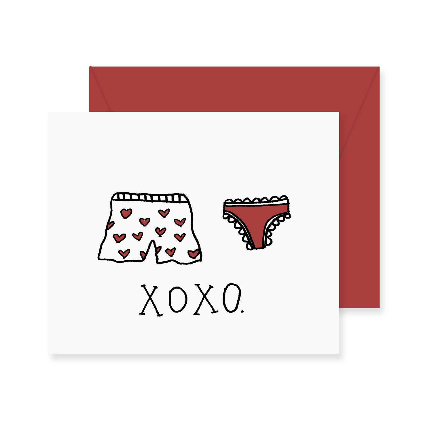One hand-sketched "XOXO" underwear greeting card, printed on premium 100% recycled paper, with coordinating envelope.