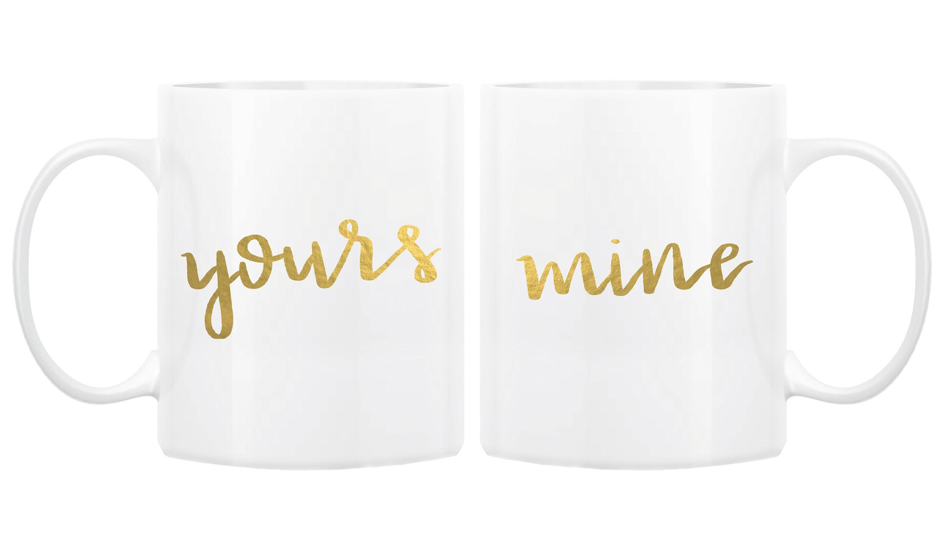 Two hand-sketched "Yours" & "Mine" gold foil coffee mugs. Design is printed on both sides of the mug (lefties, rejoice!).
